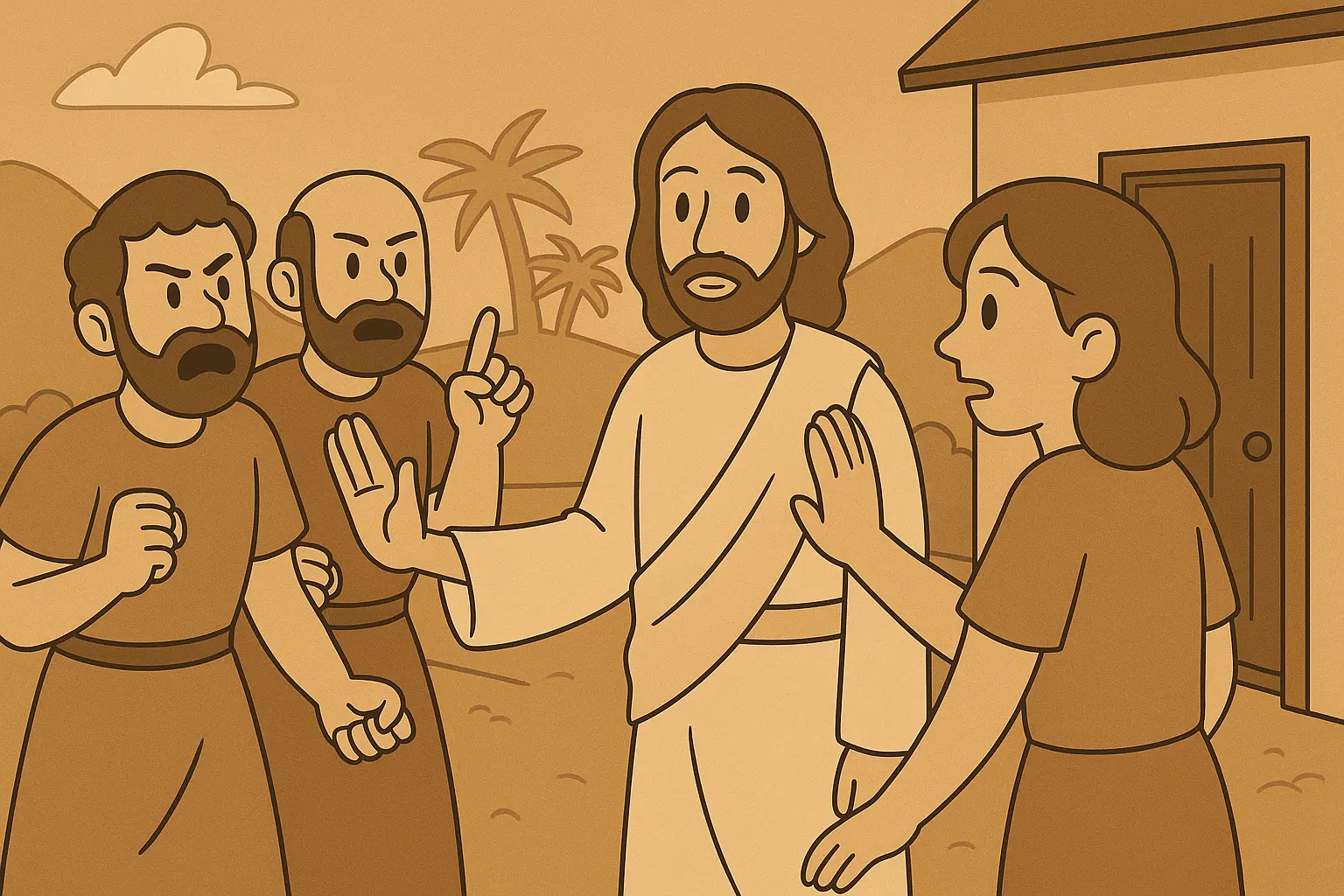 Un día, escuchó que un grupo de peregrinos pasaría por la ciudad, camino a Jerusalén. Entre ellos venía Jesús. Los rumores decían que había hecho milagros y enseñado como nadie. Marta sintió curiosidad, pero cuando oyó que pedían hospedaje, muchos vecinos cerraron las puertas. “Van hacia Jerusalén, no son de aquí”, murmuraban.
