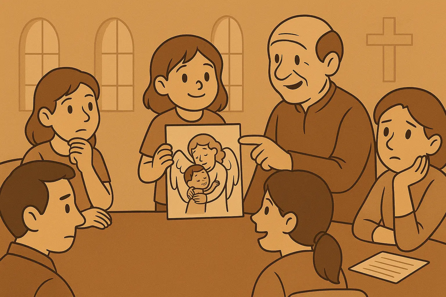 El párroco, viendo el ambiente, pidió una pausa y llevó al grupo a la capilla para proclamar el Evangelio del día. Al terminar, guardó silencio. Entonces, se abrió la puerta y entró Lucerito, una niña del catecismo que había llegado antes que su mamá. Venía con una mochila grande y un dibujo en la mano.